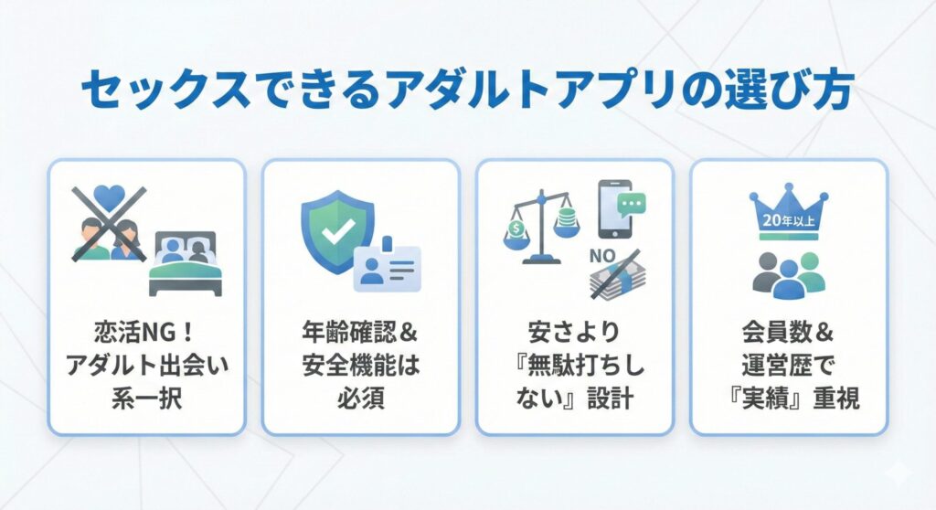 「出会える・出会えない」以前に、“前提がズレていないか”が一番大事です。セックス目的なら、最初から話が通じる場所を選びましょう。